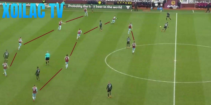 Khi đó, lối đá được kích hoạt đồng loạt nhằm cắt đứt hướng triển khai bóng. Cách vận hành này giúp đội bóng kiểm soát không gian trung tuyến và hạn chế các pha tấn công trực diện.
