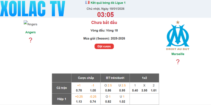 Dưới đây là bảng tỷ lệ kèo tham khảo cho trận đấu giữa Angers SCO và Olympique Marseille: